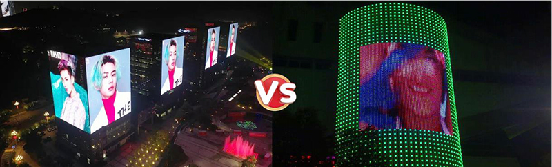 qm球盟会从事LED显示屏产品已经有20年历史了,实力雄厚,产品质量过硬。那么我们的LED共形屏跟传统LED点光源、洗墙灯有哪些区别呢,可以从一下几个方面对比: